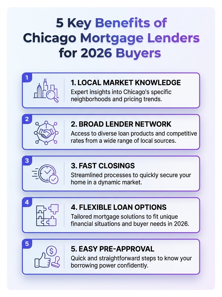 This infographic highlights five key benefits of Chicago mortgage lenders for 2026 buyers. It helps buyers compare lenders quickly and make informed decisions.